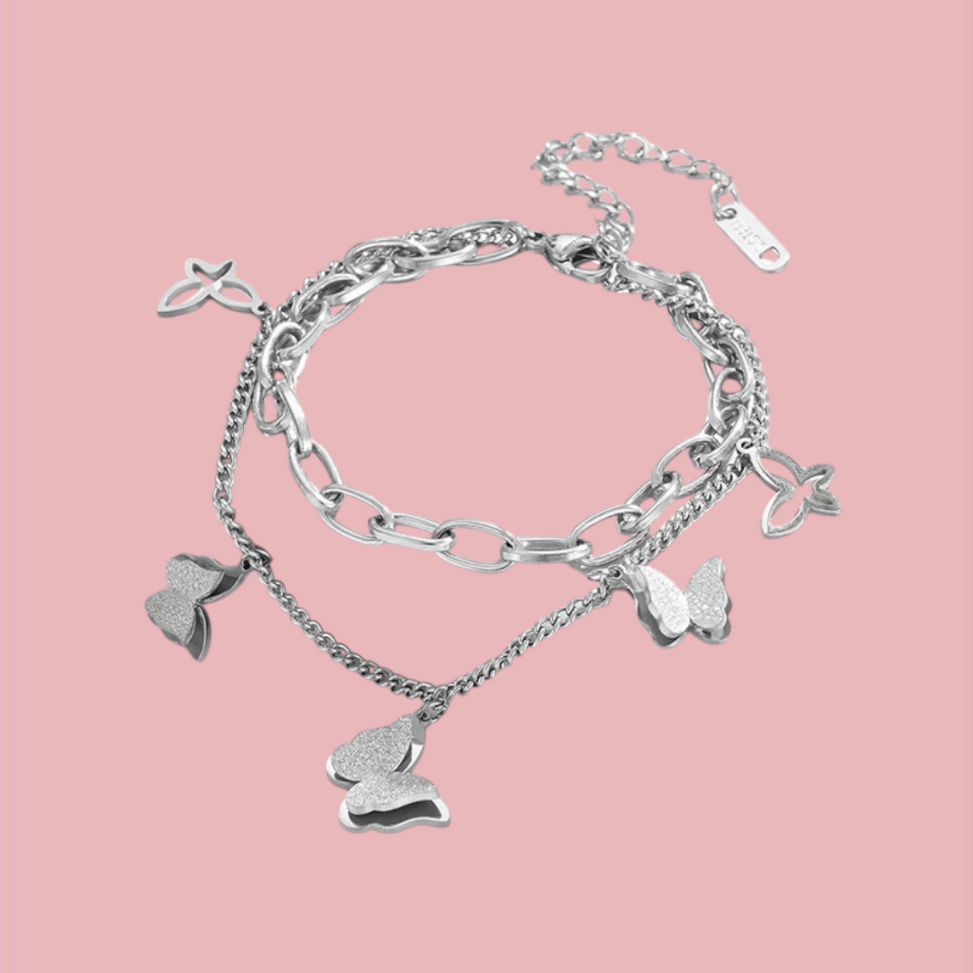 Bracciale con doppia catena con pendenti a forma di farfalle, caratterizzato da una combinazione di maglie delicate e dettagli romantici. Ideale per aggiungere un tocco femminile e luminoso a qualsiasi look.