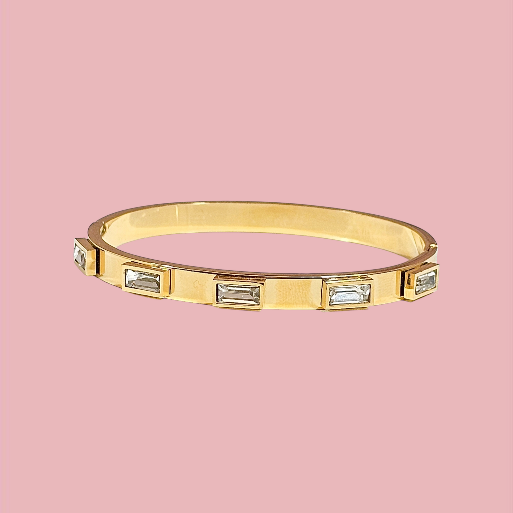 Un bracciale che unisce rigore e splendore. Le gemme taglio baguette incastonate simmetricamente rappresentano equilibrio, raffinatezza e una bellezza strutturata e senza tempo.